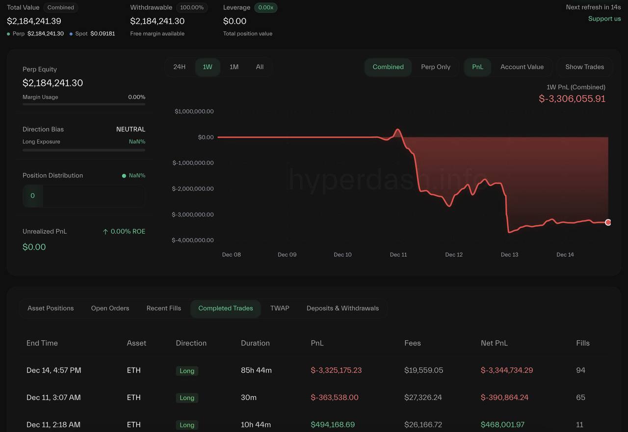 He has made 3 trades, 2 of them losing, racking up over $3.3M in losses in just 4 days.