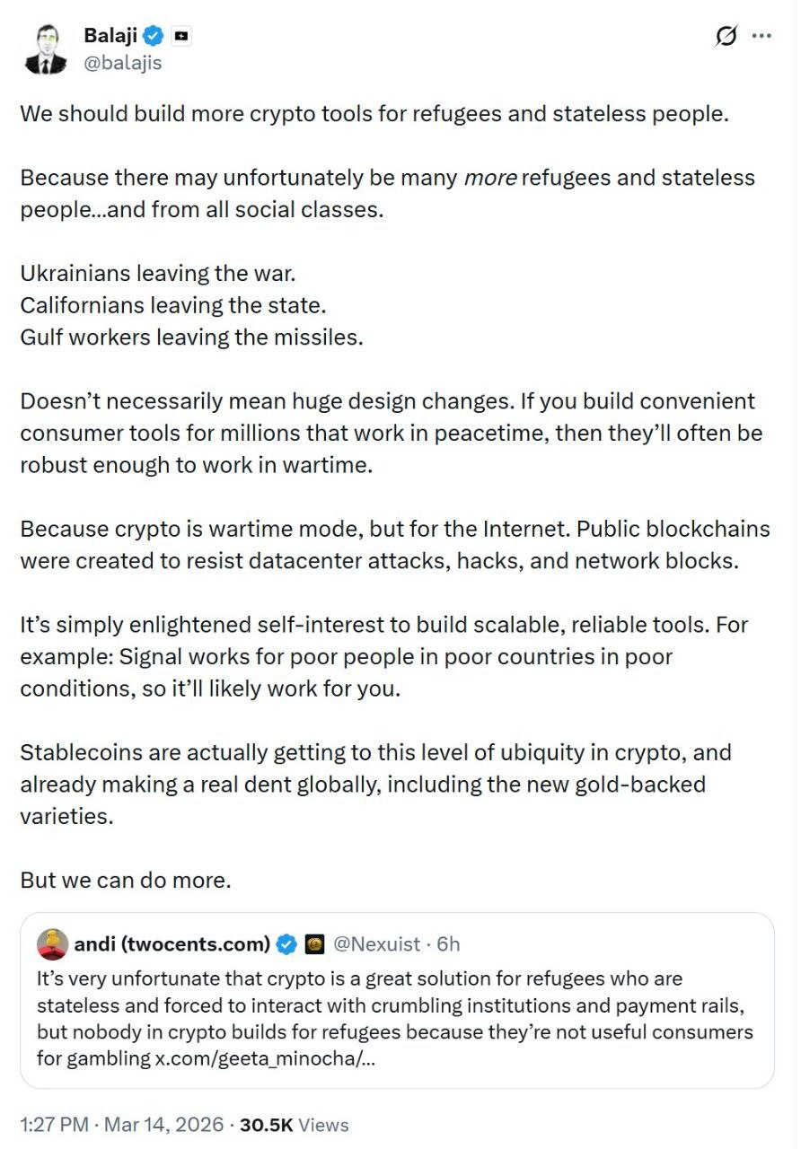 โก INSIGHT: Balaji Srinivasan says the crypto industry should start building financial tools specifically for refugees and stateless people.