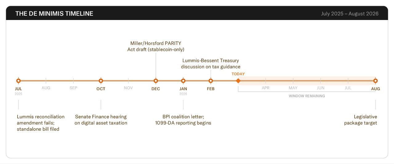 ๐จย UPDATE: Congress only has 5 months left to pass the de minimis tax exemption for small Bitcoin purchases, per The Bitcoin Policy Institute.